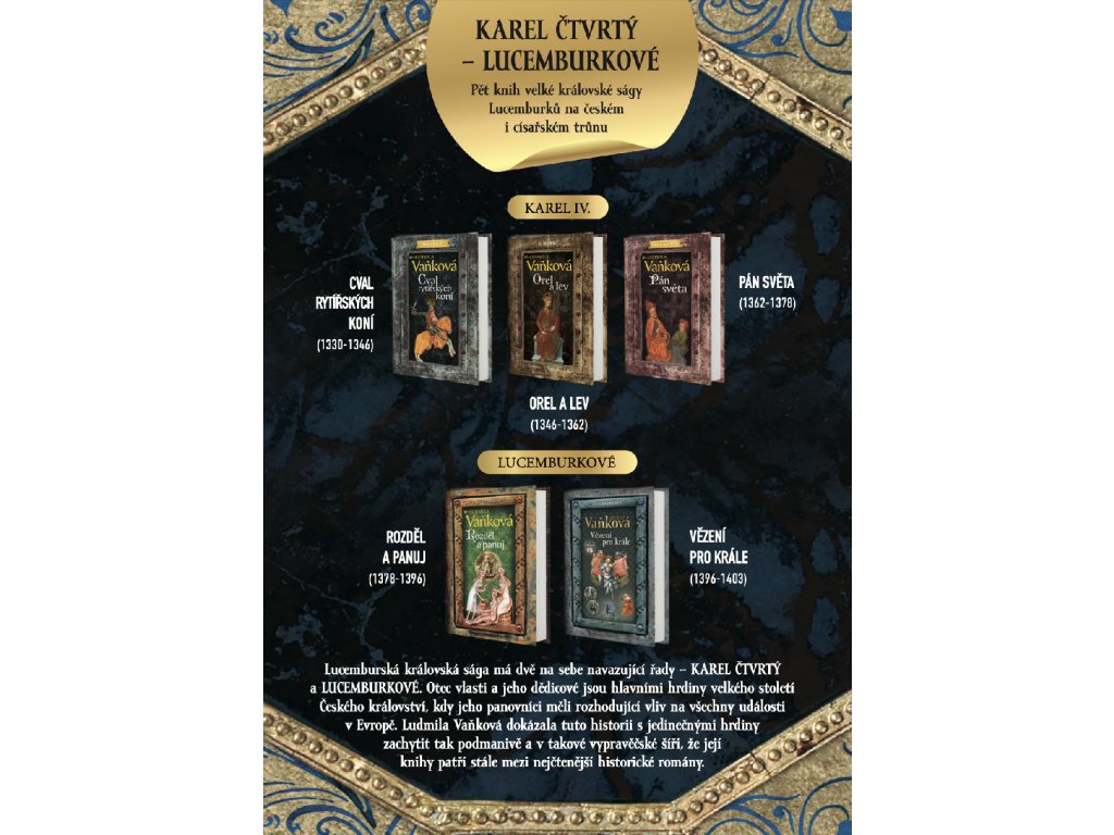 Lucemburská královská sága má dvě na sebe navazující řady – KAREL ČTVRTÝ a LUCEMBURKOVÉ. Otec vlasti a jeho dědicové jsou hlavními hrdiny velkého století Českého království kdy jeho panovníci měli rozhodující vliv na všechny události v Evropě. Ludmila Vaňková dokázala tuto historii s jedinečnými hrdiny zachytit tak podmanivě a v takové vypravěčské šíři že její knihy patří stále mezi nejčtenější historické romány.
